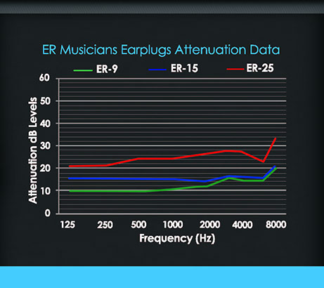 ER Musicians Earplugs have specially designed high fidelity filters that protect your hearing without compromising the clarity of music and speech. The sound quality is the same as you would hear it without earplugs, but with less volume. You can choose from three levels of sound reduction; ER-9, ER-15, ER-25. Music teachers or student musicians would be adequately protected with ER-15 filters, whereas rock performers using amplified instruments would require the higher sound reduction of ER-25’s.